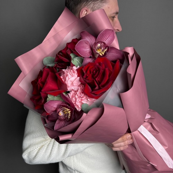 Букет из 3 красных роз, орхидей и диантуса