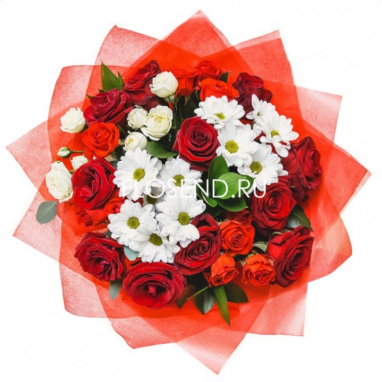 Букет из красных роз и хризантем