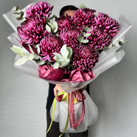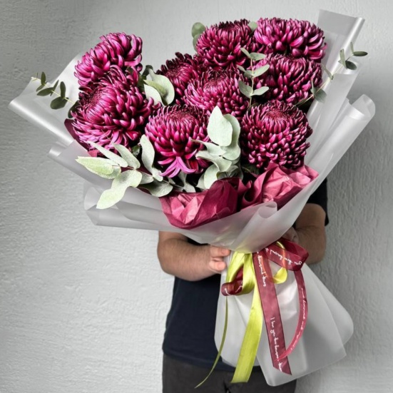 Выразительный моно букет из сезонной стойкой хризантемы "Бигуди" и эвкалипта